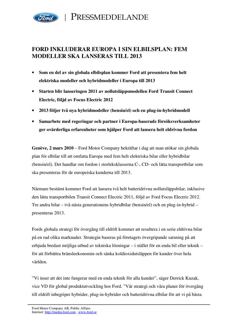 Ford Motor Company bekräftar i dag att man utökar sin globala plan för elbilar till att omfatta Europa med fem helt elektriska bilar eller hybridbilar (bensin/el). Det handlar om fordon i storleksklasserna C-, CD- och lätta transportbilar som ska presenteras för de europeiska kunderna till 2013.