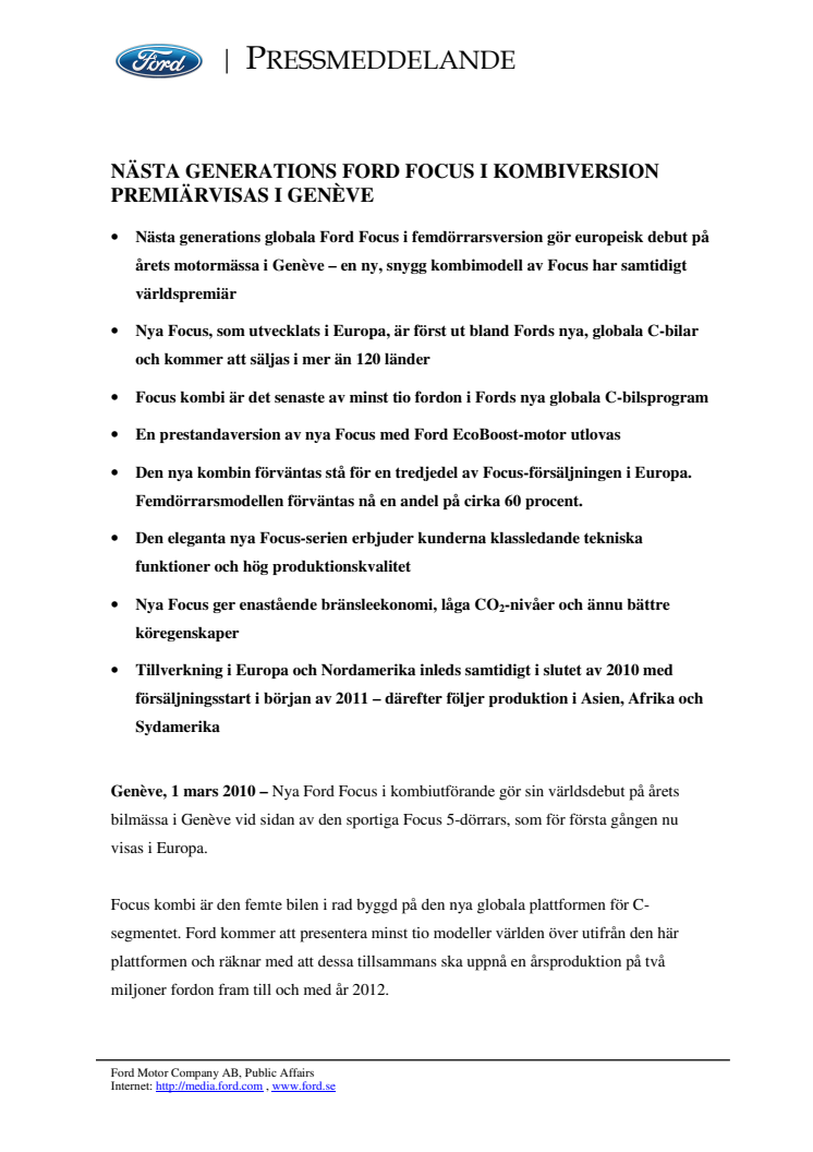 NÄSTA GENERATIONS FORD FOCUS I KOMBIVERSION PREMIÄRVISAS I GENÈVE