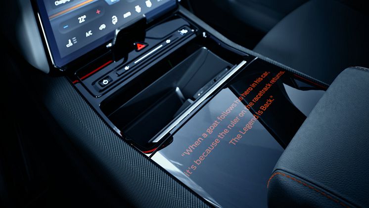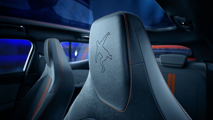 Nackstöden pryds av en siluett av hans ökända ”kung fu-spark”, broderat i tyget – ett ögonblick som blev känt över hela världen. Sätena är klädda i Feeltek Luxury Grain med orangea sömmar och dubbla racinginspirerade ränder i Signal orange. Ratten är omklädd i läder med en orange mittsektion, och golvmattorna har detaljer i nubuck och orangea sömmar.