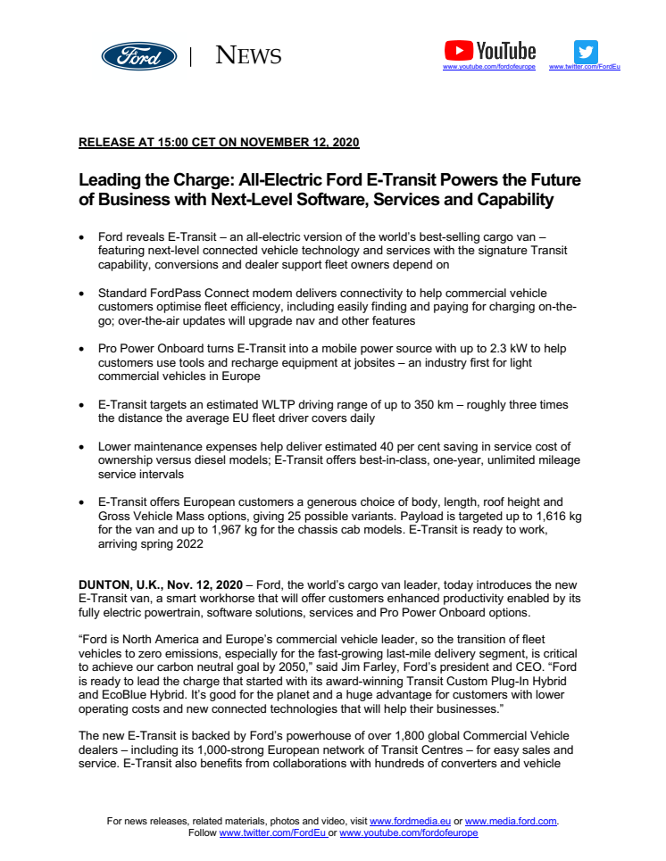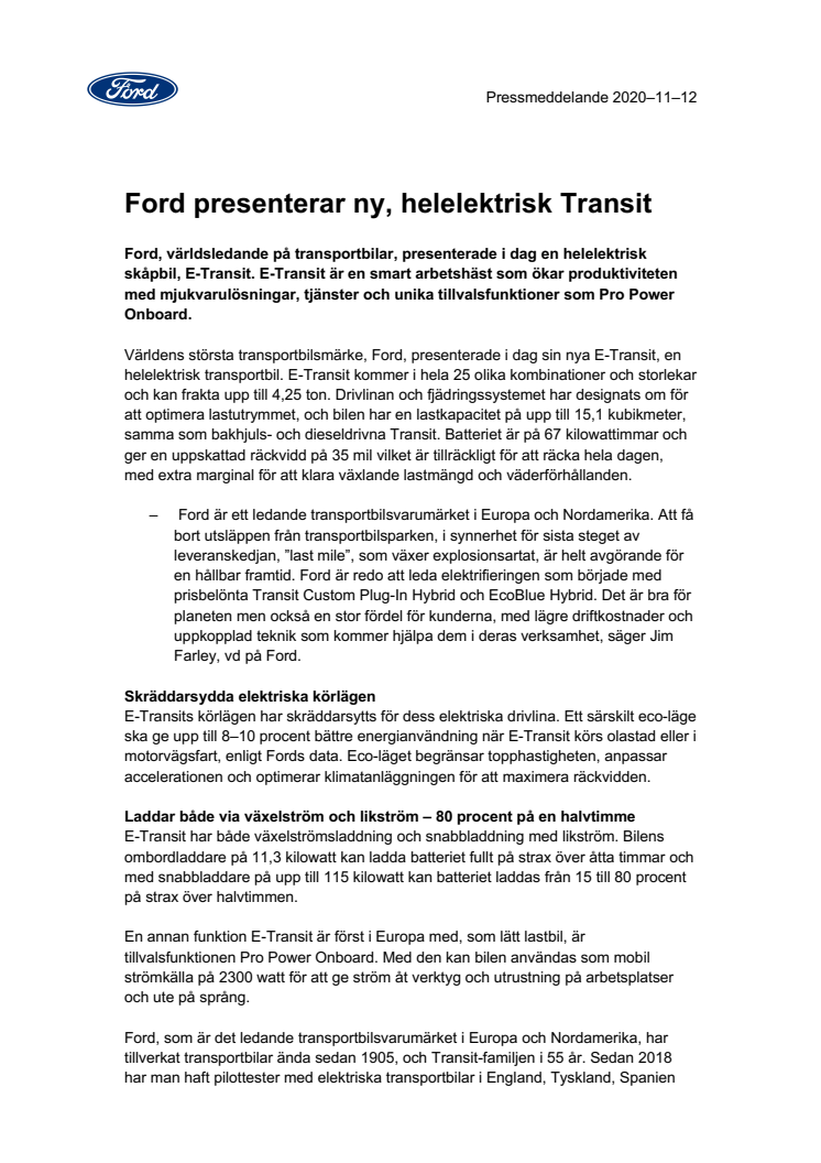 Ford, som är det ledande transportbilsvarumärket i Europa och Nordamerika, har tillverkat transportbilar ända sedan 1905, och Transit-familjen i 55 år. Sedan 2018 har man haft pilottester med elektriska transportbilar i England, Tyskland, Spanien och Turkiet för att studera hur förare använder Transit Custom Plug-In Hybrid. Utifrån de testerna har företaget dragit lärdomar om bland annat hur fordonen används och hur förarnas laddningsvanor ser ut, och använt lärdomarna i utvecklingen av E-Transit och bilens kringtjänster.