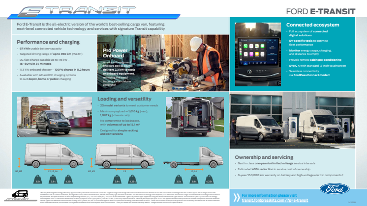 Världens största transportbilsmärke, Ford, presenterade i dag sin nya E-Transit, en helelektrisk transportbil. E-Transit kommer i hela 25 olika kombinationer och storlekar och kan frakta upp till 4,25 ton. Drivlinan och fjädringssystemet har designats om för att optimera lastutrymmet, och bilen har en lastkapacitet på upp till 15,1 kubikmeter, samma som bakhjuls- och dieseldrivna Transit. Batteriet är på 67 kilowattimmar och ger en uppskattad räckvidd på 35 mil vilket är tillräckligt för att räcka hela dagen, med extra marginal för att klara växlande lastmängd och väderförhållanden.