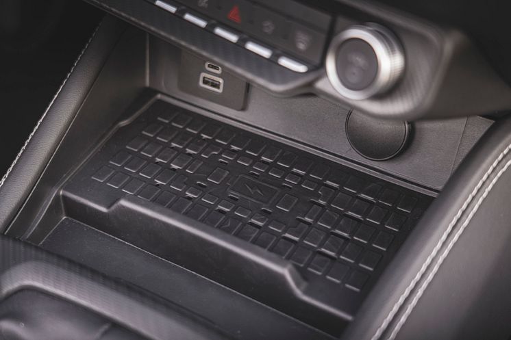 Genom att ersätta fysiska reglage för funktioner som klimatkontroll med digitala knappar på pekskärmen har man frigjort extra utrymme i mittkonsolen för personliga föremål och en trådlös laddningsplatta för smartphones.