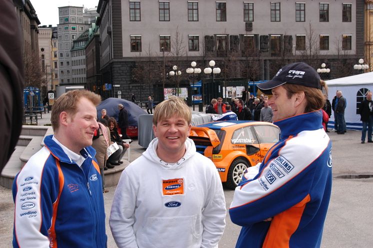 • Marcus Grönholm, Henning Solberg och Andréas Eriksson på presskonferensen i Kungsträdgården, Stockholm