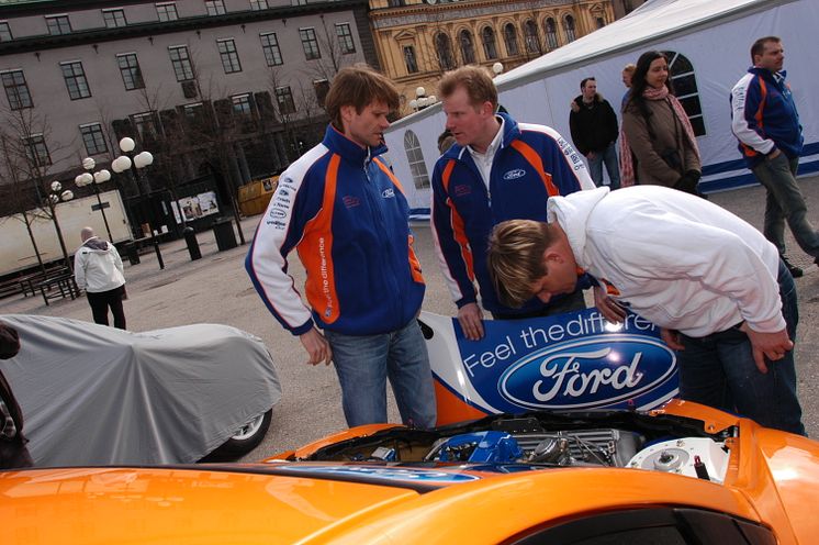 • Henning Solberg, Marcus Grönholm och Andréas Eriksson beskådar sin nya Ford Fiesta rallycrossbil